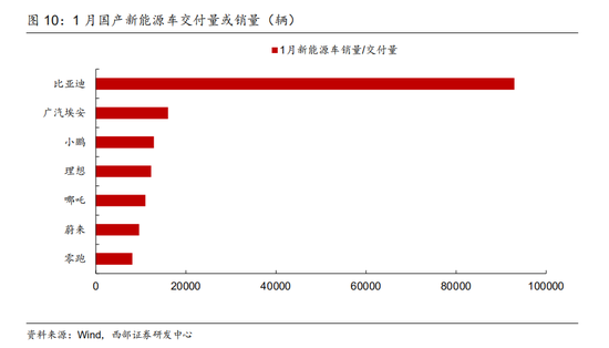 1月新能源车整体销量保持高速增长。2月3日,比亚迪官方公布乘用车1月全系销售95180台,同比增长126.1%;新能源车销售92926台,同比增长367.6%。1月份,广汽埃安今年1月全系销量16031辆新车,同比增长118%;小鹏汽车交付12922辆,同比增长115%,连续5个月交付量破万;理想汽车交付12268辆,同比增长128.1%;哪吒汽车交付11009辆,同比增长402%;蔚来汽车交付9652辆,同比增长33.6%;零跑汽车交付达8085辆,同比增长434%。
