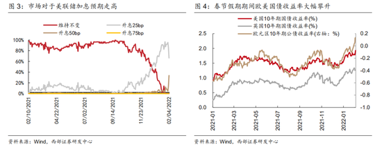 美联储官员发声安抚市场。继1月美联储FOMC会议以及发布会释放出3月结束本轮QE及上调利率空间很大,不排除未来连续加息的可能性等鹰派论调后,美联储官员态度又出现转向,1月31日曾表示如有必要可以一次加息50基点的亚特兰大联储主席博斯蒂克“改口”称,加息50个基点不是他在3月份的首选政策行动,旧金山联储主席以及堪萨斯城联储主席乔治也均表态可以循序渐进转变货币政策。美联储官员态度的松动也推动美股市场情绪回暖,1月28日至2月2日美股三大股指均反弹。至2月3日英国央行及欧央行传递的转鹰讯号叠加亮眼的非农数据再度推动市场对于美联储加息预期抬升,2月4日美国总统拜登的几位美联储理事提名人库克、杰斐逊和拉斯金表示抗击通胀应该是美联储的首要任务,暗示他们支持美国货币政策开始向鹰派转变。截至2月4日,市场预期美联储有66.3%的概率将在3月议息会议上加息25BP,有33.7%的可能性将加息50BP。随着美联储后续给出更为明确的政策退出路径,市场混乱的预期也有望迎来修正。