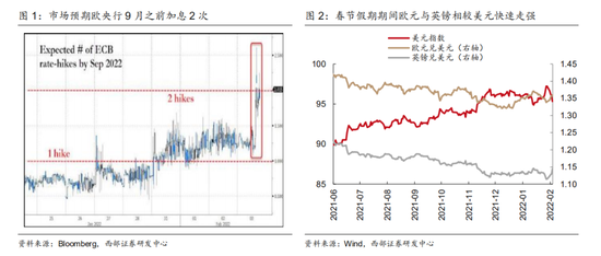 欧央行转鹰信号超预期。2月3日欧洲央行维持三大利率不变,重申2022年放缓资产购买的承诺。今年第二季度将以每个月400亿欧元的速度实施资产购买计划,第三季度以每个月300亿欧元的速度买债;从10月起每个月买债200亿欧元。相比以往,欧央行政策基调由“鸽”转“鹰”,欧洲央行最新声明重新引入多年来不用的“通胀前景风险上行”的说法,欧央行行长拉加德表示通胀高企将长于此前预期,做好了适时调整所有工具的准备,这推翻了之前“年内不加息”的论调。市场对于欧央行今年加息的预期升温,推动主要公债收益率快速上行。