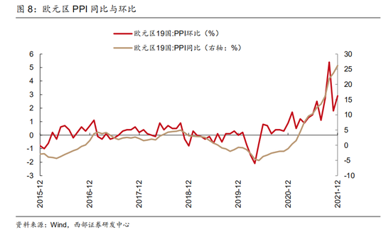 欧元区通胀压力居于高位。因能源成本飙升,欧元区19个国家12月PPI环比上涨2.9%,同比上涨26.2%。而欧洲央行公布的季度专业预测调查报告(SPF)显示,今年欧元区整体通胀率将回落至3%(较2021Q4预测提高了1.1个百分点),2023年则进一步降至1.8%(较2021Q4预测提高了0.1个百分点)。