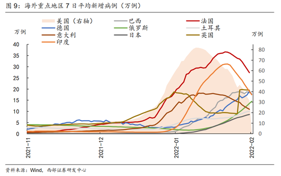 海外疫情拐点已现,主要发达国家新增病例迅速回落。根据Worldometer数据显示,截至北京时间2月5日6时30分,全球累计确诊新冠肺炎病例3.9亿例,全球单日新增确诊病例301万例,新增死亡病例12874例,美国、巴西、法国、德国、俄罗斯是新增确诊病例数最多的五个国家。从数据来看,全球Omicron疫情峰值已过,美国日均新增病例从1月中旬80万例的高位回落至当前的30万例左右。另外一方面,奥密克戎新变体BA.2正在南非迅速传播,并在美国、印度、英国等国被发现。