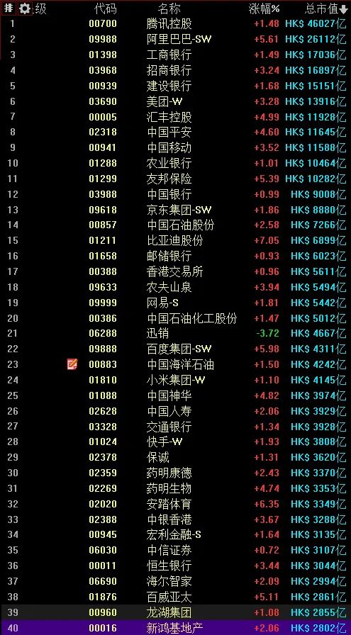 在周五,港股市值靠前的基本上是上涨的,如阿里巴巴涨5.61%,百度集团涨5.98%,比亚迪股份涨7.05%,小鹏汽车和理想汽车均涨超10%。银行、保险也表现不错。