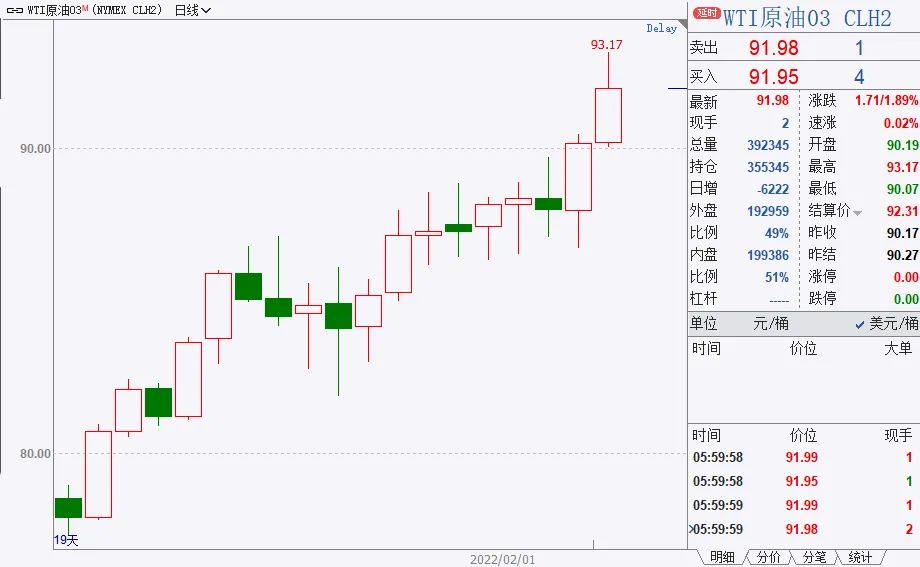 大宗商品方面,本周WTI原油期货突破90美元,主力合约周五盘中一度达到93.17美元,结算价92.31美元。