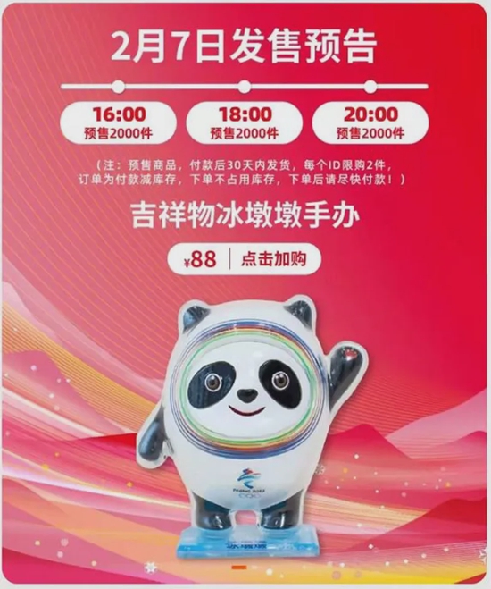 据悉,除线下排队购买外,冰墩墩手办目前只能通过预售形式在奥林匹克天猫官方旗舰店购买。以2月7日的发售情况为例,店铺分别在16:00、18:00和20:00分三批开放预购,每批预购数为2000件,只是付款后并非立即发货,发货周期将在30天内。