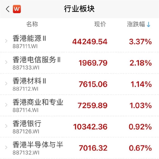 从盘面上来看,周期股大幅领涨,油气、建筑装饰等板块涨幅居前。港股方面,能源股集体大涨。截至发稿,能源板块涨超3%,材料、银行等板块也涨幅居前。