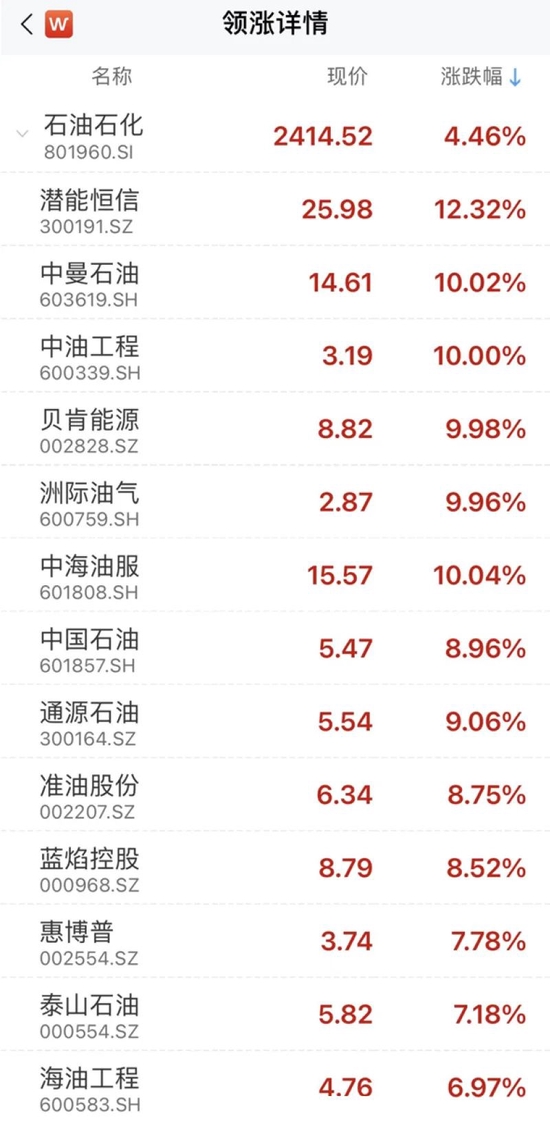 今日盘面上,油气开采及服务板块表现尤为强势。中国石油大涨超8%,中曼石油、中油工程、贝肯能源、洲际油气等多股封板。