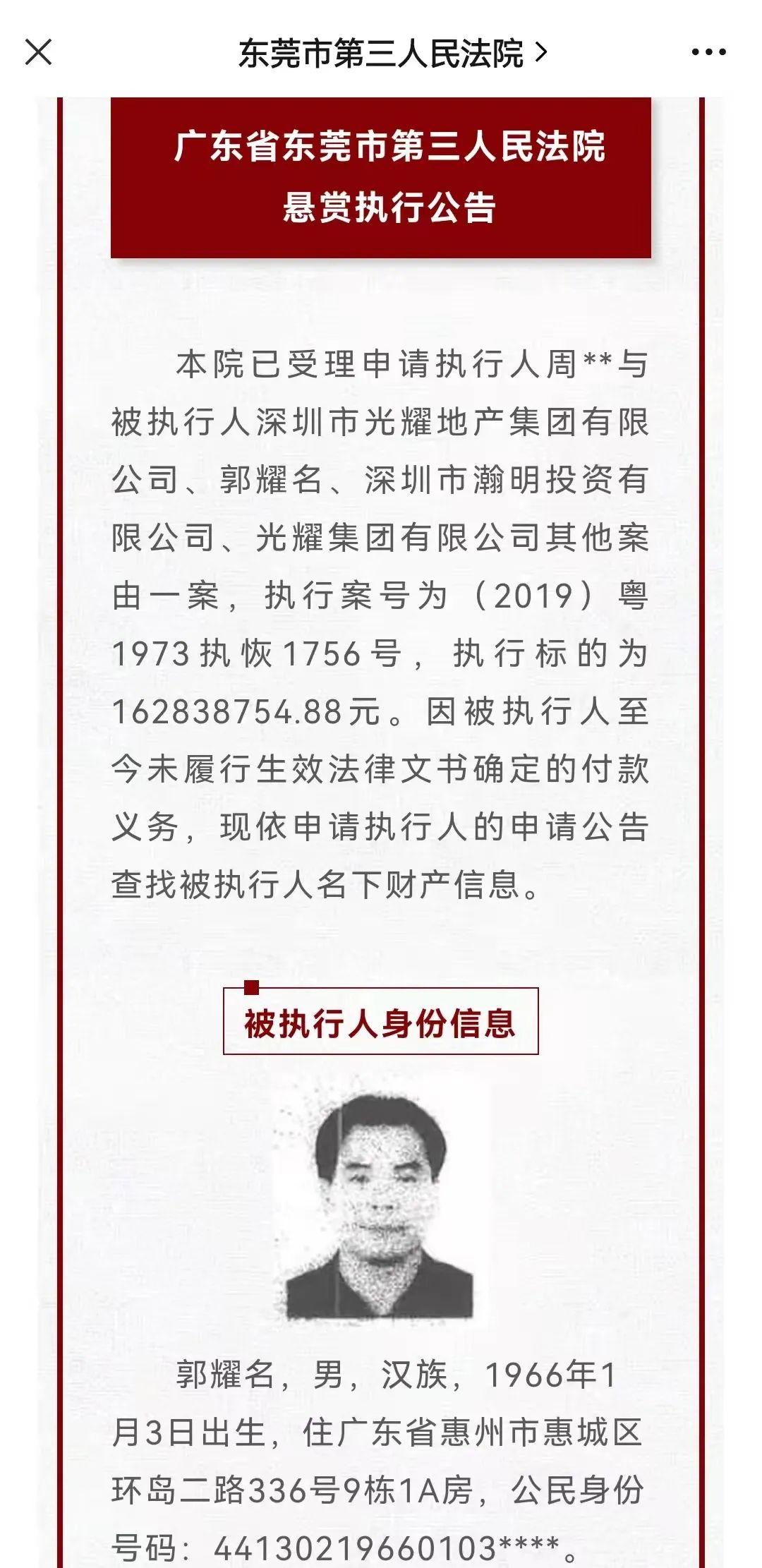 值得注意的是,远走香港的郭耀名曾于去年被东莞法院悬赏160万,找寻其线索。虽然比起2100万追债山西首富李兆会差了不少,但烂尾的楼盘还在那儿,当年的壮志豪言也还在,老板却至今未归。
