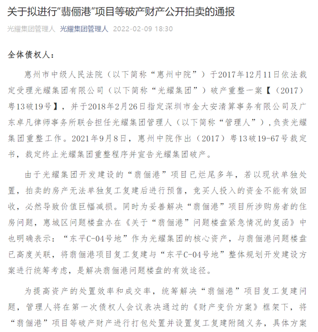 2月9日晚,光耀集团有限公司管理人公告称,拟将烂尾已久的“翡俪港”项目连带部分地块以及房产等破产财产以评估价总价3.99亿元进行公开拍卖。