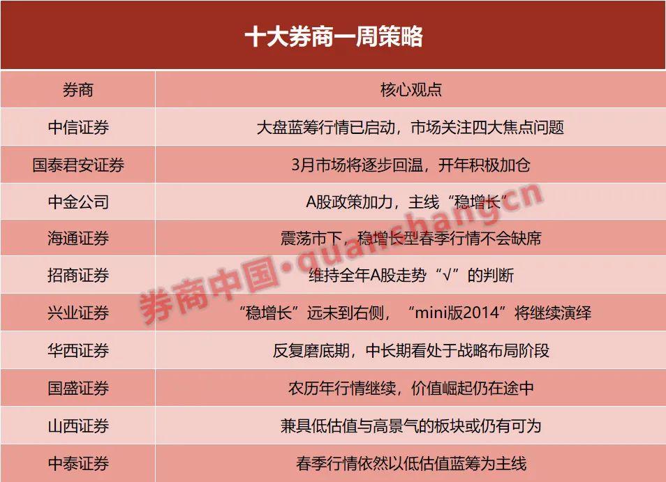 中泰证券表示,从整体来看,在全球金融市场逐步适应美联储鹰派转向、国内降准等稳增长政策继续发力、社融等指标有望企稳的大环境下,春季行情有望更进一步。而全面注册制与稳增长对低估值蓝筹的利好,而美联储“鹰派”或使成长板块承压,以及1月调整过程中上证50等低估值蓝筹的强势与不创新低,都使得我们认为,春季行情依然是低估值蓝筹为主线。