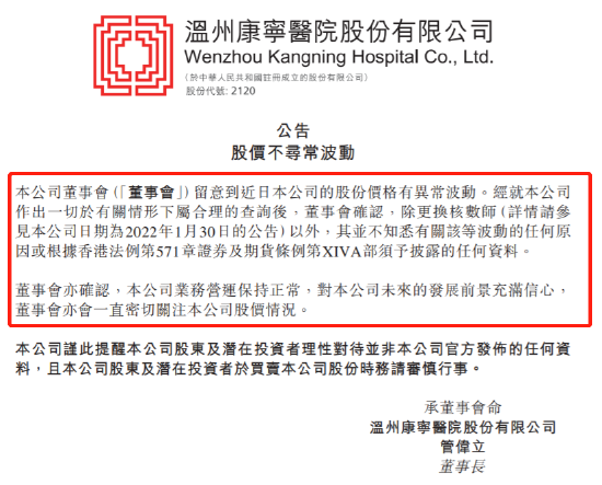 热点栏目 康宁医院发布公告表示,董事会留意到近日公司的股份价格有异常波动。经就公司作出一切于有关情形下属合理的查询后,董事会确认,除更换核数师以外,其并不知悉有关该等波动的任何原因或根据香港法例第571章证券及期货条例第XIVA部须予披露的任何资料。(小浪注:公司股价自1月30日更换核数师跌了近50%)