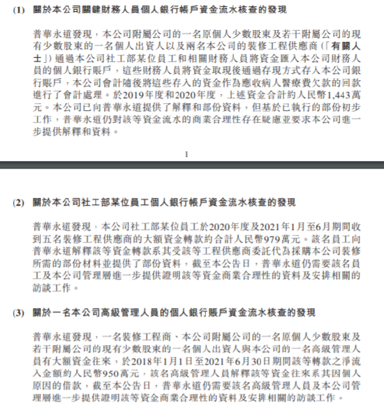 值得注意的是,2020年9月,公司开始接受国泰君安的辅导又向A股发起冲刺,去年9月16日康宁医院股东大会审议并批准A股创业板上市议案。依照中国证监会要求进行了资金流水核查。但核查后,负责审计的普华永道会计师事务所指出三大异常,直接辞任!