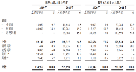 从收入分类明细来看,该公司收入来源也发生了明显变动,业务重点逐渐向网剧倾斜。数据显示,该公司各期网剧收入分别为5914.90万元、1.68亿元、1.96亿元,占总收益的比例分别为43.9%、64.8%、74.8%。可以看到,网剧收入呈现明显的增长,时至2021年前三季度,网剧收入占比已超七成。