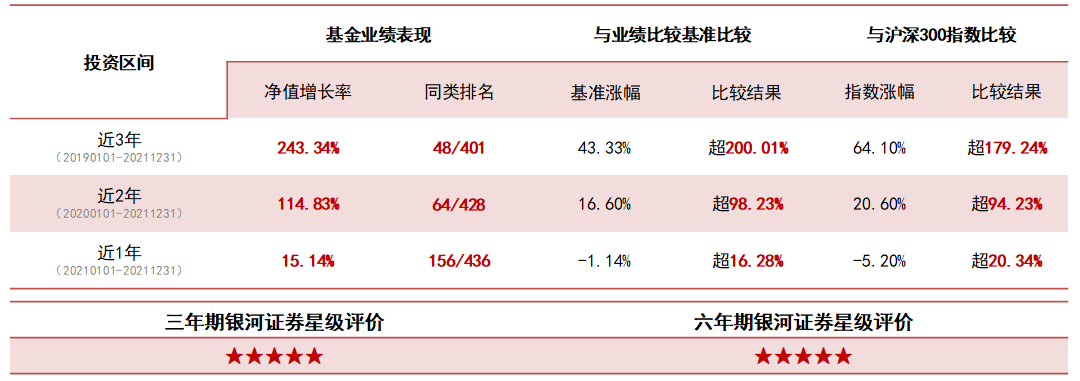 (基金净值增长率数据经托管行复核,同期业绩比较基准收益率与沪深300指数涨幅来自Wind,基金排名数据、基金星级评价数据来自银河证券,数据截至2021.12.31)