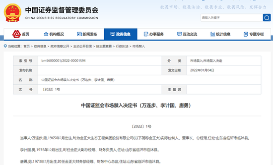 同日发布的市场禁入决定书显示,当事人万连步、李计国的违法情节较为严重,依据相关规定,证监会决定:对万连步采取10年市场禁入措施,对李计国采取5年市场禁入措施,对唐勇采取3年市场禁入措施。