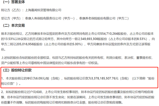 公告显示,泰康系机构当时以6.09元每股(含税)的价格受让,标的股份转让价款为约33.78亿元。