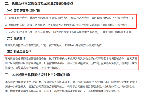 既包括公司治理、未来分红、业绩承诺及补偿,也包括“项目获取和代建代销”、“融资合作”、“物业全面合作”等方面的合作内容。