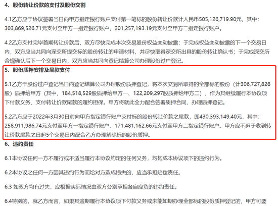 相关股权转让公告曾称泰禾建材将于股份过户登记当日办理股份质押登记,并应于2022年3月30日之前支付泰康系约4.3亿元尾款,股份质押方可解除,否则构成违约。(见下图)