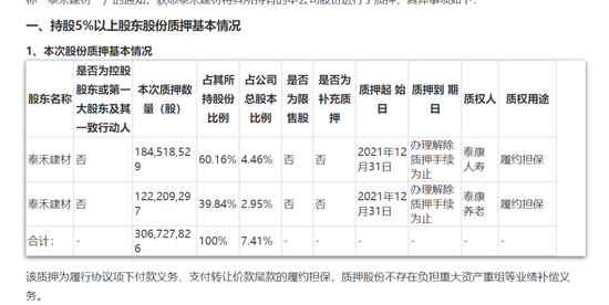 今年的1月5日,阳光城也发布公告称,接到公司持股5%以上股东泰禾建材的通知,获悉泰禾建材将其所持有的本公司股份进行了质押,质押对象就是泰康人寿以及泰康养老。(见下图)
