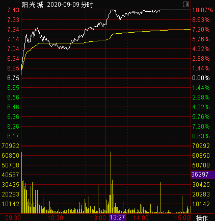 2020年9月,泰康系入股时,阳光城的A股股价以涨停相迎,当日收盘达到7.43元每股(下图),泰康系瞬间浮盈20%以上。