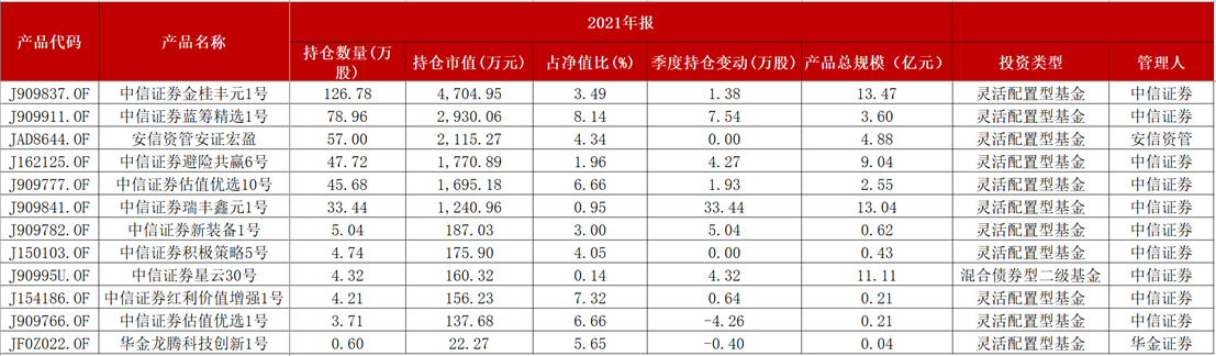Wind数据显示,根据券商资管产品披露的2021年第4季度报告,12只产品合计持有412.20万股,持仓总市值约为1.53亿元,其中10只产品属于中信证券旗下,3只产品规模超10亿元。