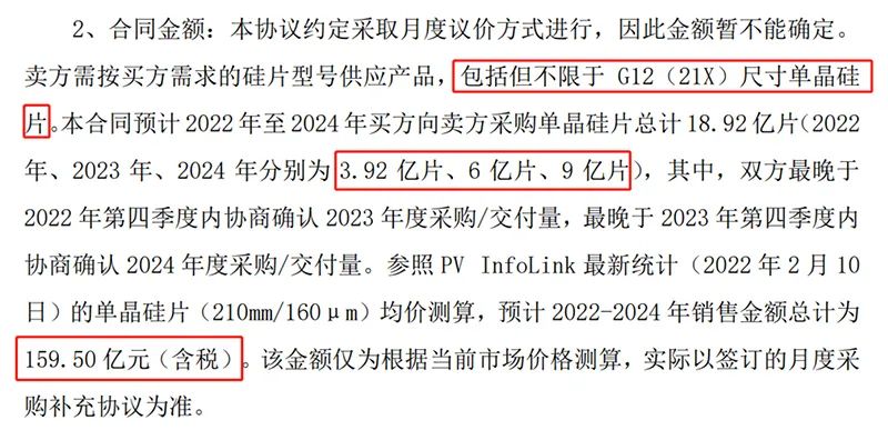 具体来看,天合光能的采购周期为3年,其中2022年、2023年、2024年分别为3.92亿片、6亿片、9亿片;供货硅片尺寸包含但不限于G12 尺寸,意味着公司大尺寸单晶硅片产品“大卖”。
