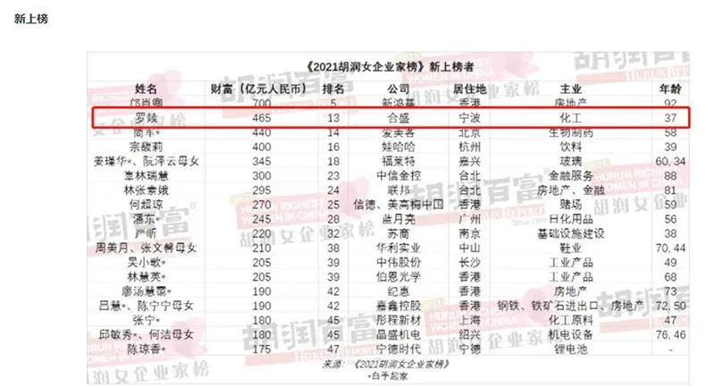 股价起伏带来财富消长。在2021年11月胡润公布的《2021胡润女企业家榜》中,合盛硅业副董事长罗燚首次上榜,以37岁的年龄和465亿元的财富,位列胡润2021年女企业家榜第13名,成为浙江新晋女首富。