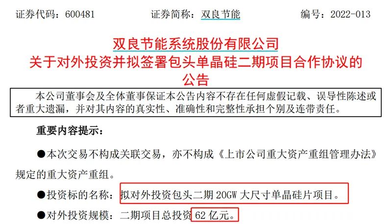 在资金端,去年8月,双良节能发布定增预案,拟募资不超过35亿元,投向包头双良40GW单晶硅一期项目(20GW)及补充流动资金。