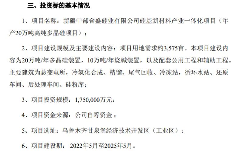 根据公告,合盛硅业本次年产20万吨高纯多晶硅项目预估投资金额达175亿元,实施主体为全资子公司新疆中部合盛硅业有限公司(以下简称 “中部合盛”);地点位于新疆乌鲁木齐市甘泉堡经济技术开发区(工业区);拟建设20万吨/年多晶硅装置,10万吨/年烧碱装置,及配套工程;实施周期为3年。