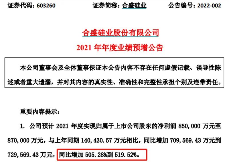 热火朝天兆“丰年”。2021年,合盛硅业所处硅料赛道迎来高景气度,两大核心产品产销两旺,拉动业绩暴增。根据业绩预告,合盛硅业预计2021年度实现净利润85亿元至87亿元,同比增长逾5倍。