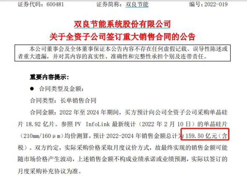 2021年第四季度里,双良节能更是连连出击,分别拿下2份、1份和3份硅片销售长单。按签订时的市场价格,预计销售金额分别达227.6亿元、65.27亿元和121.44亿元。