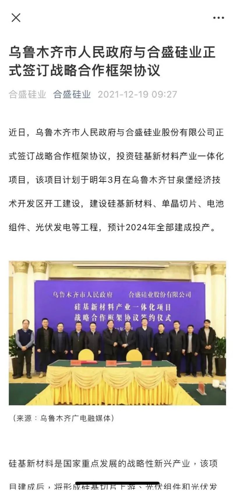 去年12月,合盛硅业已通过微信公众号中 “透底”该项目的“预备工作”。文章称,公司与乌鲁木齐政府签订战略合作框架协议,计划于2022年3月在甘泉堡经济开发区开工建设硅基新材料产业一体化项目,建设内容涵盖硅基新材料、单晶切片、电池组件、光伏发电等。