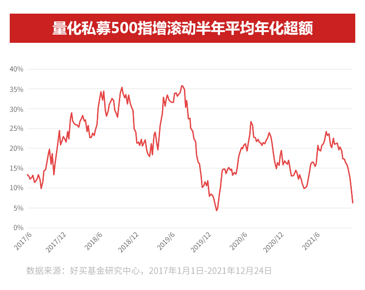 上图统计了2017年以来,量化私募500指增滚动半年的年化超额。这张图如何理解呢?如果我们买入了500指增产品并持有半年,我们获取的年化超额可能是5%也可能是35%,这是因市场环境的不同而波动的。