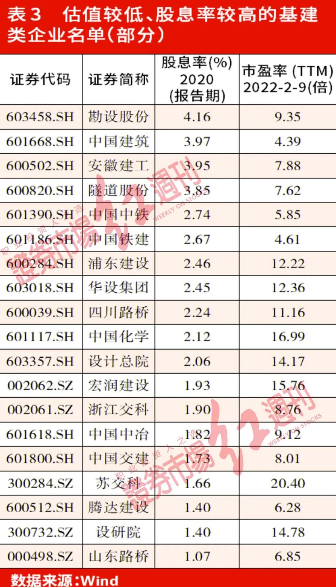 与此同时,基建的股息率则处于相对高位水平。据《红周刊》记者统计显示,以2020年分红数据为基数,目前申万基建板块整体股息率为2.38%,仅低于银行(4.59%)、地产(4.13%)、采掘(3.99%)、钢铁(3.56%)等少数几个行业。