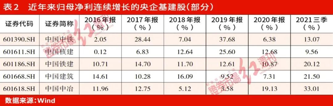 事实上,近年以来,受益于在手订单不断增长,很多基建公司均实现了业绩的平稳连续增长,尤其以中字头的央企最为明显。《红周刊》记者统计发现,从Wind板块9家央企基建来看,2016年~2020年以及2021前三季度,均实现业绩连续增长的公司即有5家,如中国中铁、中国核建等(见表2)。
