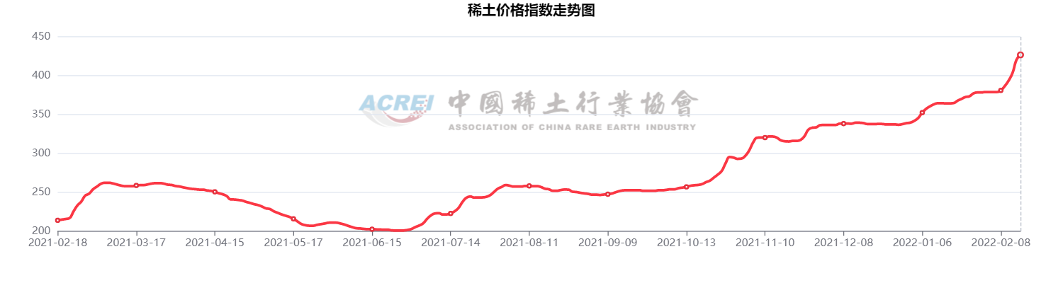 自2021年6月以来,国内稀土市场价格指数持续上涨。中国稀土行业协会统计显示,2月15日稀土价格指数为426.8,较前一日上涨6.2点,创历史新高。