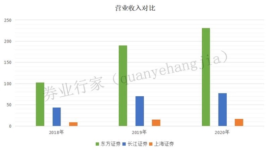 营业收入数据显示,2020年度,东方证券揽收231.34亿元,同比增长21.42%;长江证券为77.84亿元,同比增长10.68%;上海证券为17.13亿元,同比增长11.96%。