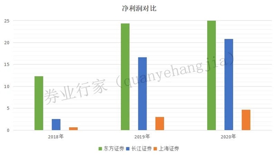 净利润数据显示,2020年东方证券创利27.23亿元,同比增长11.82%;长江证券为20.85亿元,同比增长25.19%;上海证券为4.66亿元,同比增幅为54.24%。