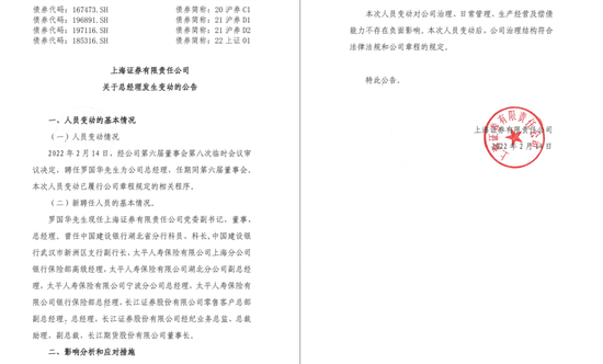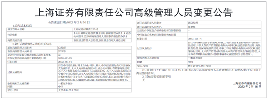 就在今天(2022年2月16日),上海证券报刊发了《上海证券有限责任公司高级管理人员变更公告》。自2022年2月14日起,罗国华新任总经理,杨艳红新任副总经理。
