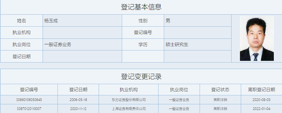 公开信息显示,杨玉成生于1965年,经济学硕士,高级经济师。早年曾在上海财经大学任教。在证券行业,他的第一站是君安证券,自1993年8月至1999年1月期间任证券投资部总经理助理。其后,他在申能集团担任多项职务。期间2004年5月至2007年3月曾任东方证券财务总监、副总经理。2009年7月,杨玉成重返东方证券,在副总裁之位上任职长达11年之久,直至2020年5月离职。