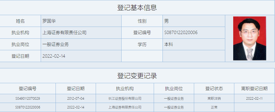 2019年11月,罗国华出任长江证券副总裁。2022年元旦,长江证券发布高管变动公告称,罗国华因个人原因辞去长江证券一切职务。彼时行家就收到消息称,罗国华将赴任上海证券。