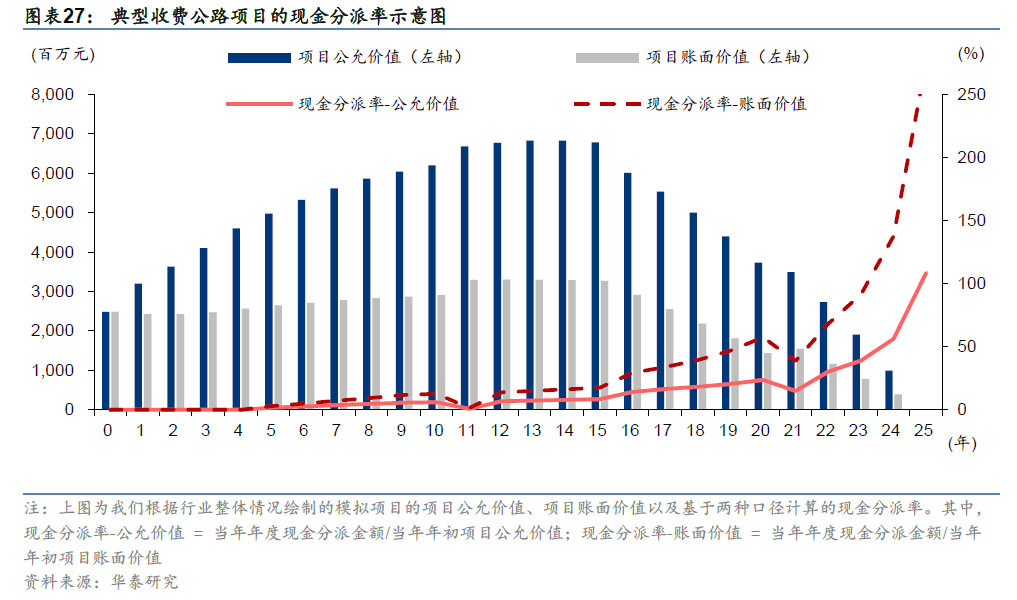 对于有特定经营期限的单项资产,现金分派率指标的可比性是受限的。在分子端,可供分配现金流因盈利增长和贷款归还而逐步提升;在分母端,在剩余收费期较短时,收费期限逐渐减少使特许经营权项目的账面价值和公允价值都逐渐下降,最终残值为零。在剩余收费期较短时,分子向上、分母向下,使得收费期限越短的项目现金分派率越高,现金分派率体现为投资回报率与本金归还比例之和,不适用于不同期限资产的横向比较。当特许经营期足够长时,收费期对现金分派率影响较小,现金分派率才具备横向可比性。