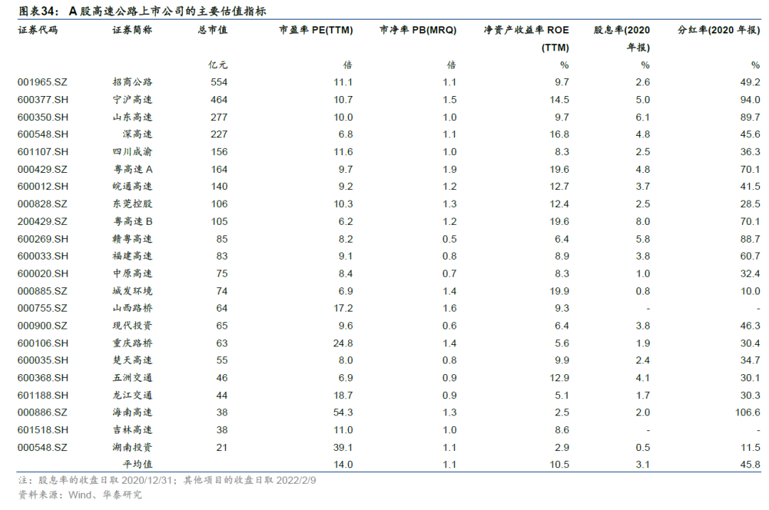 公募REITs应时而生,按照底层分类已上市3只高速REITs。随着我国经济结构转为存量经济时代,以及低利率环境等都为REITs发展提供了外在条件。公募版RETIs也被赋予盘活存量资产、促进基建高质量发展、降低杠杆率等宏观积极意义。2021年5月17日,证监会核准9只基础设施证券投资基金(以下称公募REITs,即Real Estate Investment Trusts )的注册批复,在完成询价后,5月31日向公众投资者发售。6月21日正式上市交易。12月新增4只上报交易所,其中华夏越秀高速(180202.OF)、建信中关村(508099.OF)也已上市。整体来看,目前已上市的11个项目中有3只以高速公路为底层资产的REITs项目,包括第一批平安广州交投广河高速公路REIT(180201.OF)、浙商证券沪杭甬杭徽高速REIT(508001.OF),以及12月在深交所上市的华夏越秀高速公路REIT。此外,华夏中国交建高速公路REIT(未上市)仍处于审批中,拟于上交所上市。