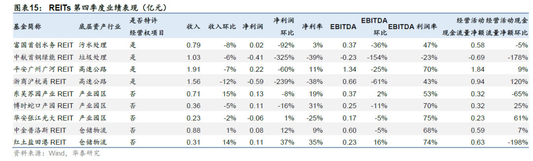 首批九只公募REITs 2021四季报出炉,基金整体业绩表现较三季度有所下滑,仅仓储物流项目收入和净利润保持增长。特许经营类公募REITs中,高速公路类公募REITs三季报表现较为突出,平安广州广河REIT和浙商沪杭甬REIT分别实现净利润0.55亿和0.42亿元,EBITDA利润率分别达到86%和95%,但四季度业绩均显著下滑,二者净利润分别环比下滑60%和239%,EBITDA分别环比下滑25%和61%。平安广州广河REIT四季度业绩下滑一方面是收入微降,另外主要是成本端上行,其中项目层面主营业务成本环比增加22%;浙商沪杭甬REIT受12月杭州市新冠疫情防控影响,通行车辆减少,收入环比下降12%,同时由于公司养护成本各期发生不均匀,四季度支付养护费用约2100万元,使得EBITDA大幅降低。中航首钢绿能REIT的收入规模尚可,但盈利能力稍显不足,四季度其净利率和EBITDA利润率分别为-39%和-23%,主要系公司约定于本年12月末与外部管理机构进行年终运营管理成本结算,项目公司层面运营管理服务费环比提升56%。非特许经营类项目的盈利受折旧摊销的影响更大,华安张江光大REIT和中金普洛斯REIT的折旧摊销占收入比例分别达到104%和72%。较高的折旧摊销导致非特许经营类项目单从净利润规模来看不如特许经营类项目,但其EBITDA利润率均围绕在70%附近,排除折旧摊销影响后盈利能力较强。