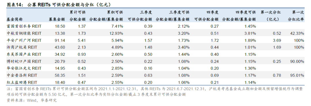 特许经营权类公募REITs累计可供派息比率较高,四季度沪杭甬可分配利润明显下降。已有5只公募REITs提前分红,由于公募REITs要求每年将90%以上可分配金额通过现金分红分配,我们可以将可供分配金额与募集金额的比率估算目前的潜在派息比率。特许经营权类公募REITs的累计派息比率明显高于产权类公募REITs。从具体项目看,中航首钢绿能表现较为不错,三四季度派息比率均超过3%,平安广州广河和浙商沪杭甬累计派息比率也相对较高,均高于4.5%,四季度沪杭甬可供分配利润下滑明显主要受疫情扰动收入下降、养护成本(2100万)、预留资本性支出(2954万)增加影响;大多数产权类项目的累计派息比率均不超过3%,三、四季度派息比率仅略微超过1%。一方面是因为特许经营权类项目到期价值归0,且现金流较稳定,期间分红率天然较高;产权类项目因底层资产是不动产,更关注物业未来的增值空间,因此分红率偏低。两类资产投资逻辑不同,应关注综合收益,即现金流分派率+基金净值增长率。此外,中航首钢绿能项目的累计可供分配金额中包含期初的留存资金,所以当前累计派息比例较高;广河项目累计可供分配金额也受到发行募集金额与偿还外部借款本金及购买基础设施项目支出差额较大影响;这部分资金不属于公募REITs成立后的经营性现金流,需要注意这部分分红金额在未来是不可持续的。