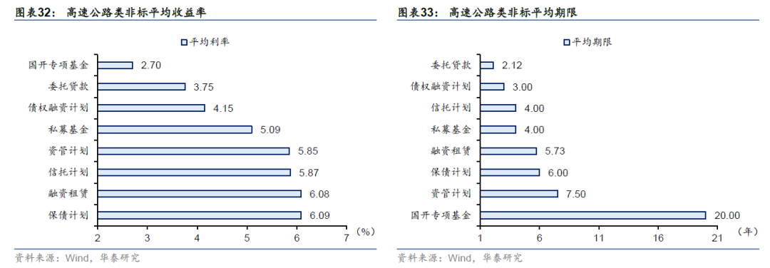 高速公路类非标资产主要品种有融资租赁、信托、资管计划、保债计划、债权融资计划、私募基金等。由于银行贷款是我国高速公路企业最主要的融资途径,且高速公路资金使用期限较长、具有一定公益性,非标融资整体不多。且非标一般来讲均为私募产品,公开信息较少,数据难以获得,我们从所有发债高速公路企业中的募集说明书中找到了14家企业披露其非标融资的信息,虽然样本量较少,但仍能从看出一些规律。根据14家样本统计,共涉及148只非标融资,包括融资租赁、信托、资管计划、保债计划、债权融资计划、私募基金等,其中融资租赁占大头,有107只,委托贷款次之,有14只。从收益率来看,除国开专项基金外其他非标的收益率相比公开市场债券略高,反映了一定的风险溢价;保债计划、融资租赁、信托计划、资管计划、私募基金等非标的平均收益率达到5%以上;国开专项基金的收益率最低,平均收益率仅有2.7%。当然,以上只是平均统计,具体非标的收益率要看其底层项目,优质的项目其非标融资成本也不会太高。从期限来看,国开专项基金的期限明显高于其他,平均期限为20年,是典型的低息且长期的政策扶持资金;资管计划、保债计划、融资租赁等非标的期限较长,平均期限超过五年;委托贷款的平均期限最短,仅有2.12年。