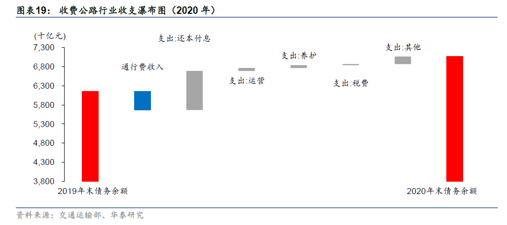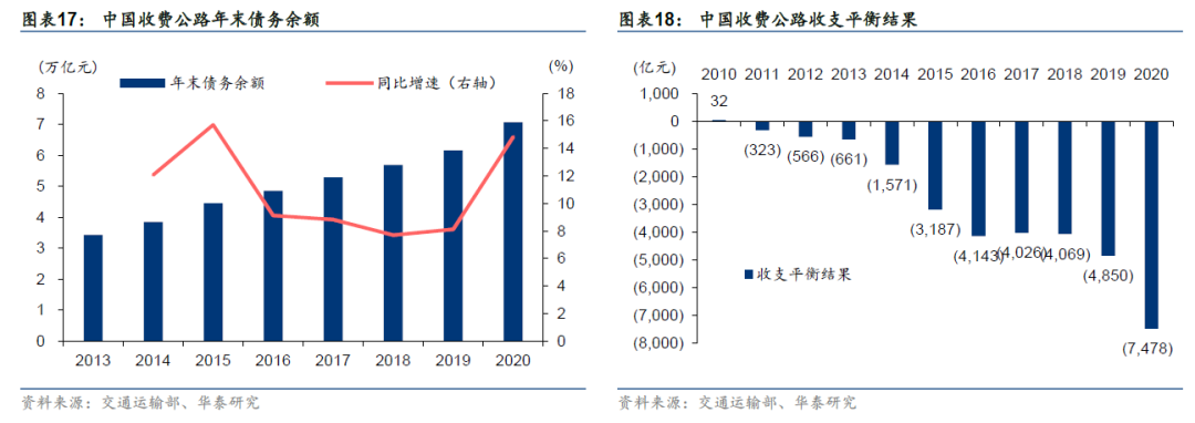 交通运输行业具有一定的区域外溢性,对区域经济拉动明显,我国适度超前建设高速公路,当前通行费收入尚不足以支付债务本息,并且净债务余额持续扩大。据《2020年全国收费公路统计公报》,2020年全国收费公路的通行费收入达到4868亿元;行业总支出达到12346亿元,其中,偿还债务本金7180亿元、偿还债务利息3061亿元,养护支出744亿元,运营管理支出755亿元,公路及附属设施改扩建工程支出312亿元;收支缺口达到7478亿元。全国收费公路债务余额在2013年至2019年期间持续扩大,并且2020年末达到7.07万亿元,占全国收费公路累计建设投资总额的65%,反映出行业总体资产负债率较高。