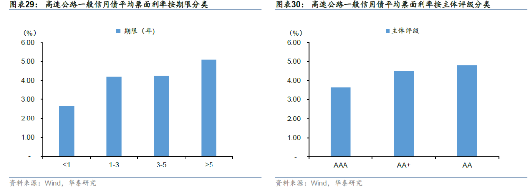 高速公路类一般信用债发债主体城投类交运平台居多,票面利率更多与主体资质而非单个项目相关。经主体主营业务筛选,截至2021年12月31日,存续一般信用债的高速公路主体共56家,债券余额4387亿,其中城投类发债主体共32家,余额达2305亿元,规模占比逾半。存量债券主体评级以中高评级为主,AAA、AA+和AA占比分别为56.19%、29.52%和13.97%。56家主体存量债券共315只,大多无抵质押。从期限来看,平均期限为4.25年,3-5年期居多,占比65.71%,最短为3-4个月,最长可达15年,较为灵活。从票面利率来看,期限越长、评级越低、票面越高;按期限分类,一年期以内债券平均票面利率较低,为2.65%,1-3年期及3-5年期平均票面利率较为接近,均在4%左右,5年期以上为5.09%;按主体评级分类,AAA、AA+和AA主体评级的债券平均票面利率分别为3.64%、4.51%和4.81%,票面利率与主体资质关联度较高。