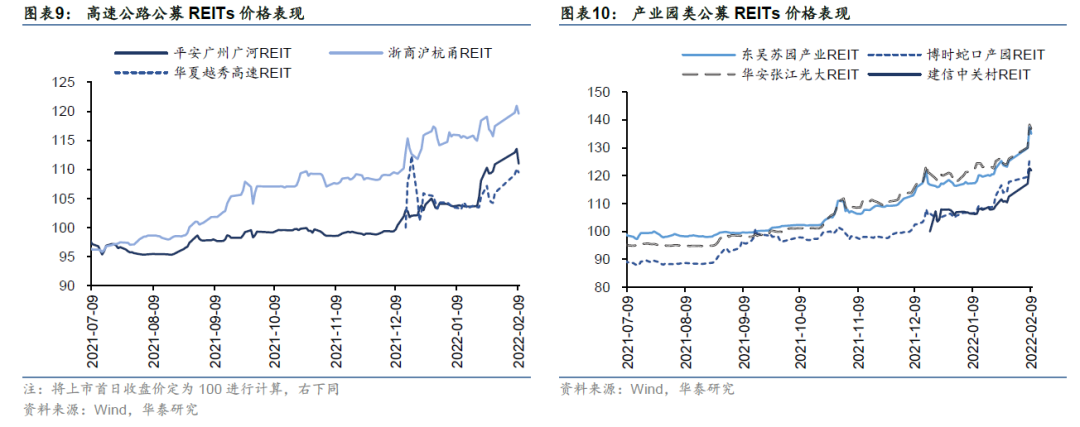 高速公路类REITs二级价格走势分化,成交较活跃。截止2022年2月9日,高速公路类REITs全部实现正收益,平均涨幅21.11%。具体来看,高速公路类REITs价格走势明显分化,浙江沪杭甬REIT和第二批上市的华夏越秀高速REITs上市以来涨幅分别为21.51%和34.41%,而平安广州广河高速REIT涨幅仅为7.40%,为当前11只公募REITs中的最小值。横向对比来看,环保类REITs、仓储物流类REITs和产业园类REITs上市以来平均涨幅分别为69.39%、58.16%和45.37%,首创水务(508006.OF)和首钢绿能REITs(180801.OF)涨幅分别为96.30%和42.48%,环保类REITs收益率最高;红土盐田港(180301.OF)、中金普洛斯REITs(508056.OF)涨幅分别为79.43%和36.89%,产业园类REITs中涨幅最大的为第二批上市的建信中关村REIT,涨幅为58.41%。从流动性来看,换手率上高速公路类与其他类别差距不大,近期上市的华夏越秀高速REIT日均换手率最高,为4.81%,浙商沪杭甬和平安广州广河分别为1.04%和1.55%,建信中关村、首创水务和蛇口产园REIT(180101.OF)换手率超过2%。