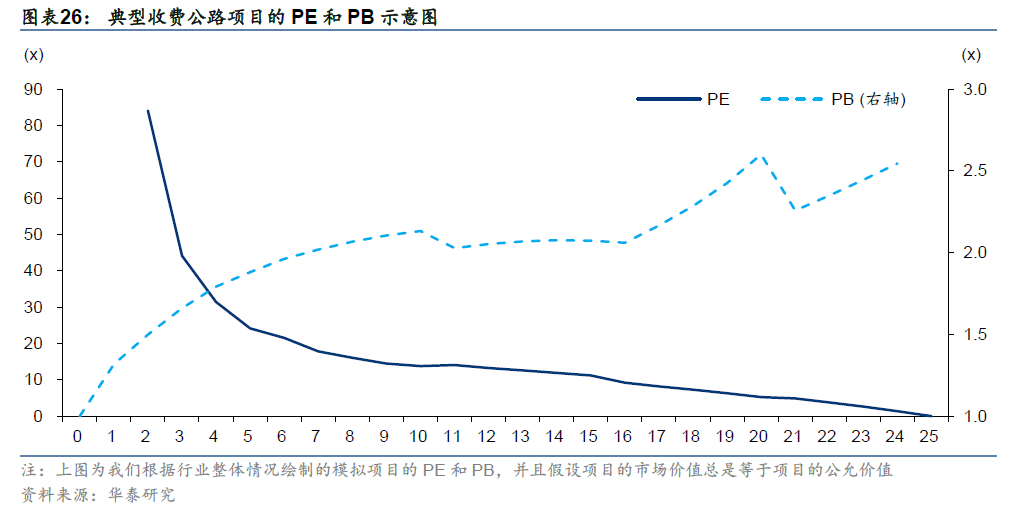 对于有特定经营期限的单项资产,市盈率PE指标并不可比。我国东部地区经营性高速公路的收费期限最长不超过25年,中西部地区最长不超过30年(《收费公路管理条例》)。当路产的剩余收费期限逐年缩短,根据绝对估值法,现金流折现总期数的减少会引起项目现值的下降;根据相对估值法,PE倍数本质上反映的是在现有盈利回报水平下,投资者愿意用多长时间收回投资,剩余收费期限减少会使得PE倍数下移。