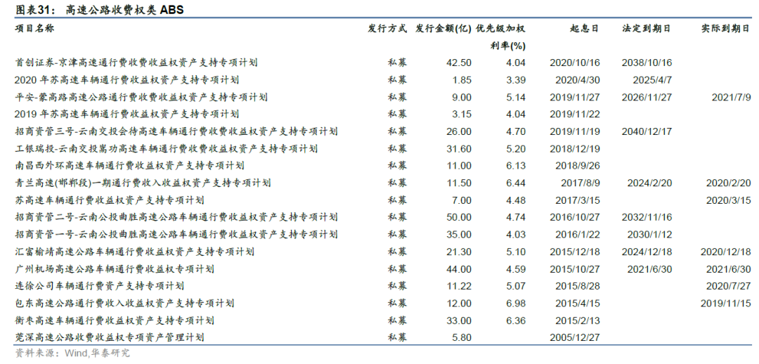 高速公路类ABS现金流来源底层项目,存在收益不及预期等风险。高速公路ABS作为一种收益权类ABS,偿付来源于企业预计的未来收益,未来现金流的稳定性与项目运营情况密不可分。在现金流方面,高速公路通行费收入收益权是高速公路类ABS的现金流来源,因此通行费价格、地区经济发展情况、及特殊优惠政策等均为影响未来现金流可靠性的关键因素。如国内首支违约的ABS“大成西黄河大桥通行费收入收益权专项资产管理计划”,基础资产为基础设施收费权(大桥过路费),较依赖运煤车通行费,而由于11-15年煤炭景气持续下行,底层项目过路费大幅下跌,归集现金流难以覆盖到期债务而违约。此外,建议关注结构设计风险。一般来说,次级的厚度越大,对优先级的保护作用越强,但次级的厚度也可能是低质量基础资产的一种增信补偿。对于高速公路ABS而言,现金流稳定性与运营主体高度挂钩,内部增信效果较为有限,因此应更加关注实际增信效果而不仅是增信形式。此外,ABS较多为私募发行,信息透明度、流动性较一般公募债较差,也需要关注资金混同风险、底层资产无法变现等风险。